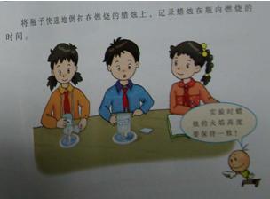 【点评】教材直接以图表的方式提供实验方法:不是将燃烧着的火柴梗伸进集气瓶,而选择了把瓶子倒扣在燃烧的蜡烛上,控制了火焰大小、高度,减少了人为因素带来的误差。既保护了学生的好奇心,又给学生今后的实验设计提供了范例。教师的讲解和层层追问,促使学生不断深入思考,关注探究过程的每个细节,从而从分体会到对比实验的必要性、严谨性。
